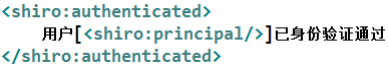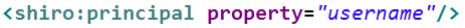 | <shiro:principal property=”username”/> | 显示用户身份信息,默认调用 Subject.getPrincipal () 获取,即 Primary Principal。 | ![]() |